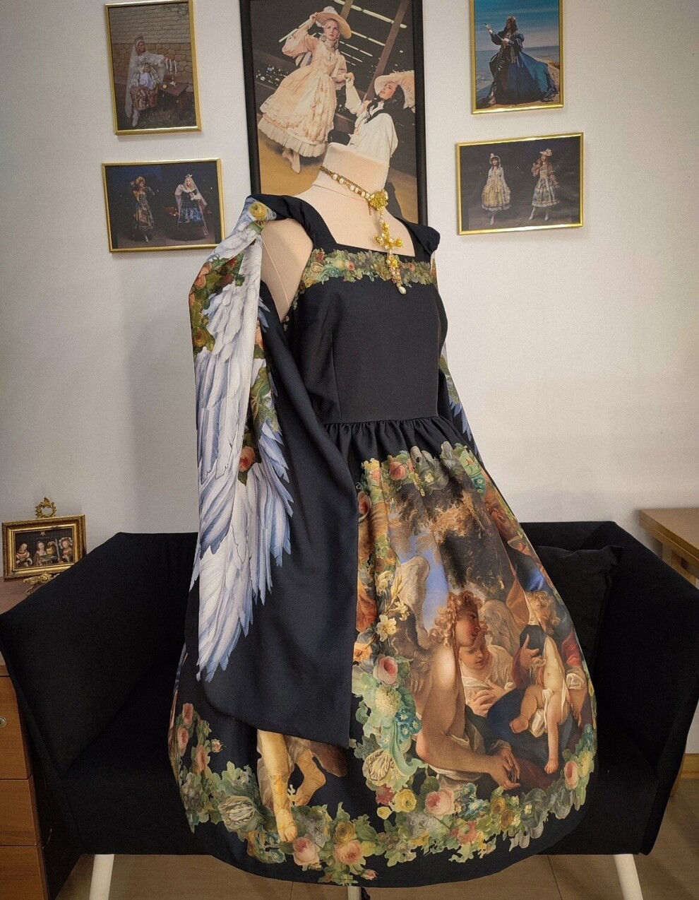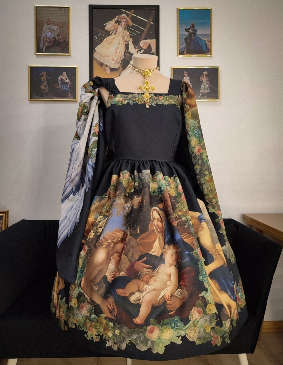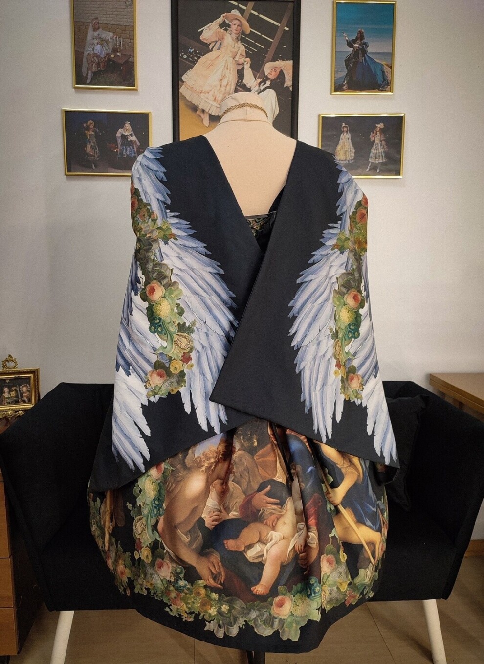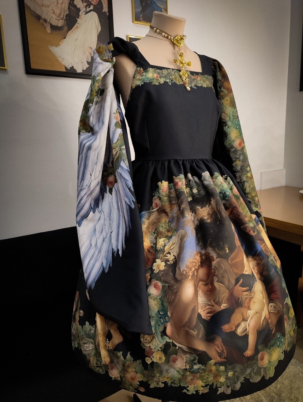Великолепное платье с авторским принтом, созданном в технике диджитал коллаж на основе произведений старых мастеров. Имеет рукава-кейп с принтом с каждой стороны: на внешней стороне картина "Благовещение" Агостино Мазуччи в пышной цветочной раме, на внутренней - крылья с гирляндами из цветов. Подол юбки также украшен цветочными гирляндами, фигурами ангелов и картиной Себастьяно Риччи "Святое семейство с ангелами" по центру.