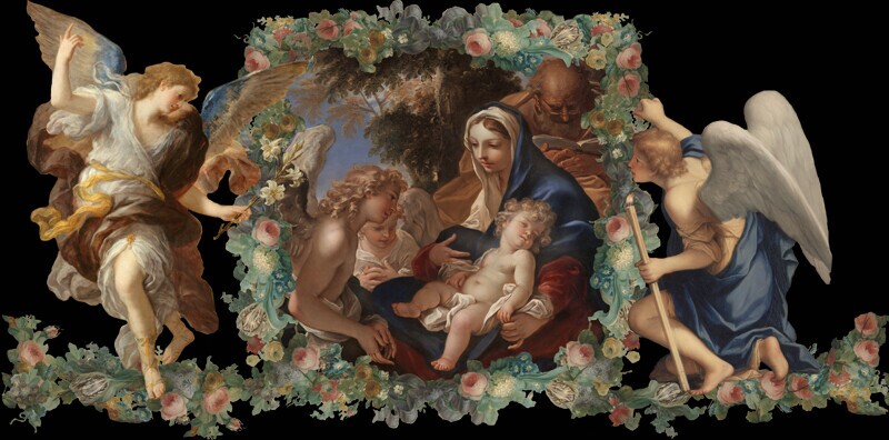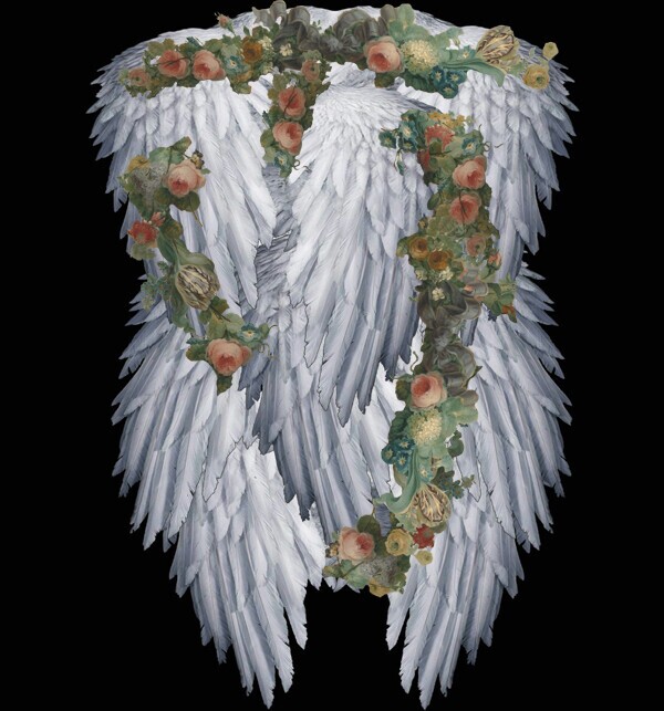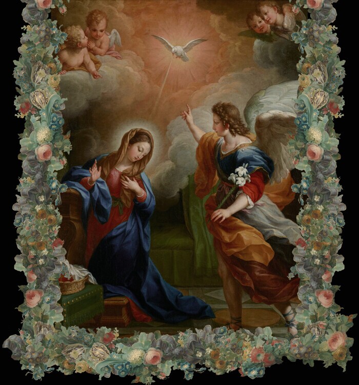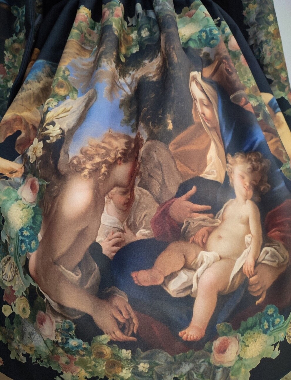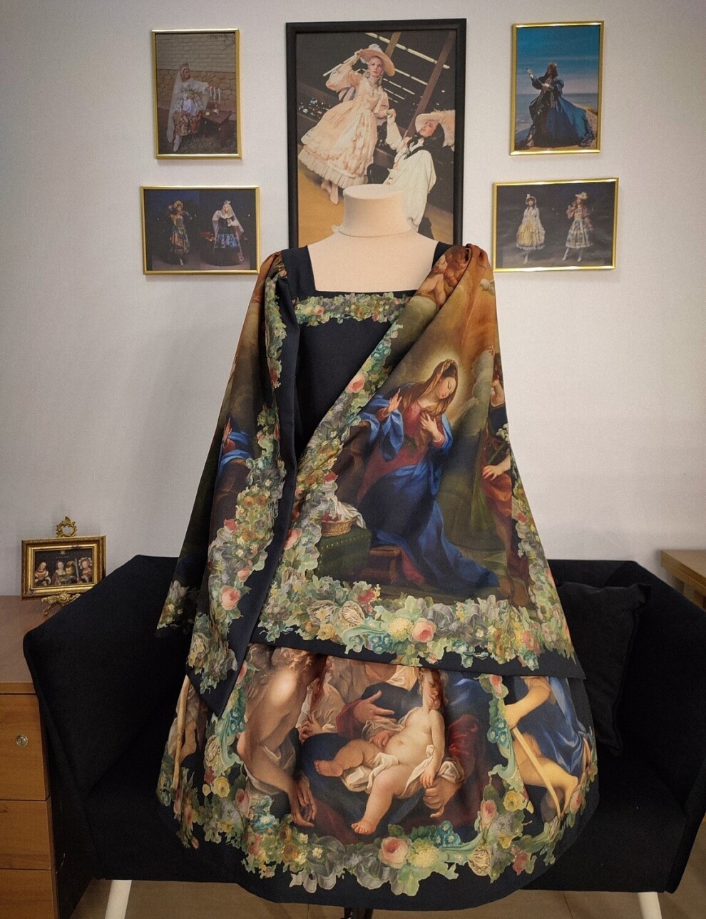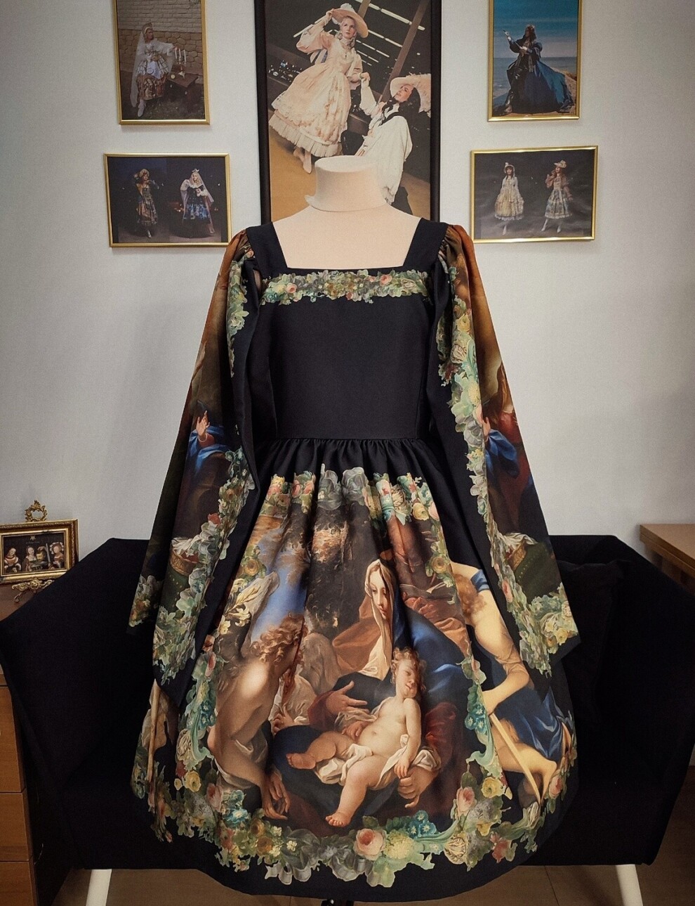 Великолепное платье с авторским принтом, созданном в технике диджитал коллаж на основе произведений старых мастеров. Имеет рукава-кейп с принтом с каждой стороны: на внешней стороне картина "Благовещение" Агостино Мазуччи в пышной цветочной раме, на внутренней - крылья с гирляндами из цветов. Подол юбки также украшен цветочными гирляндами, фигурами ангелов и картиной Себастьяно Риччи "Святое семейство с ангелами" по центру.