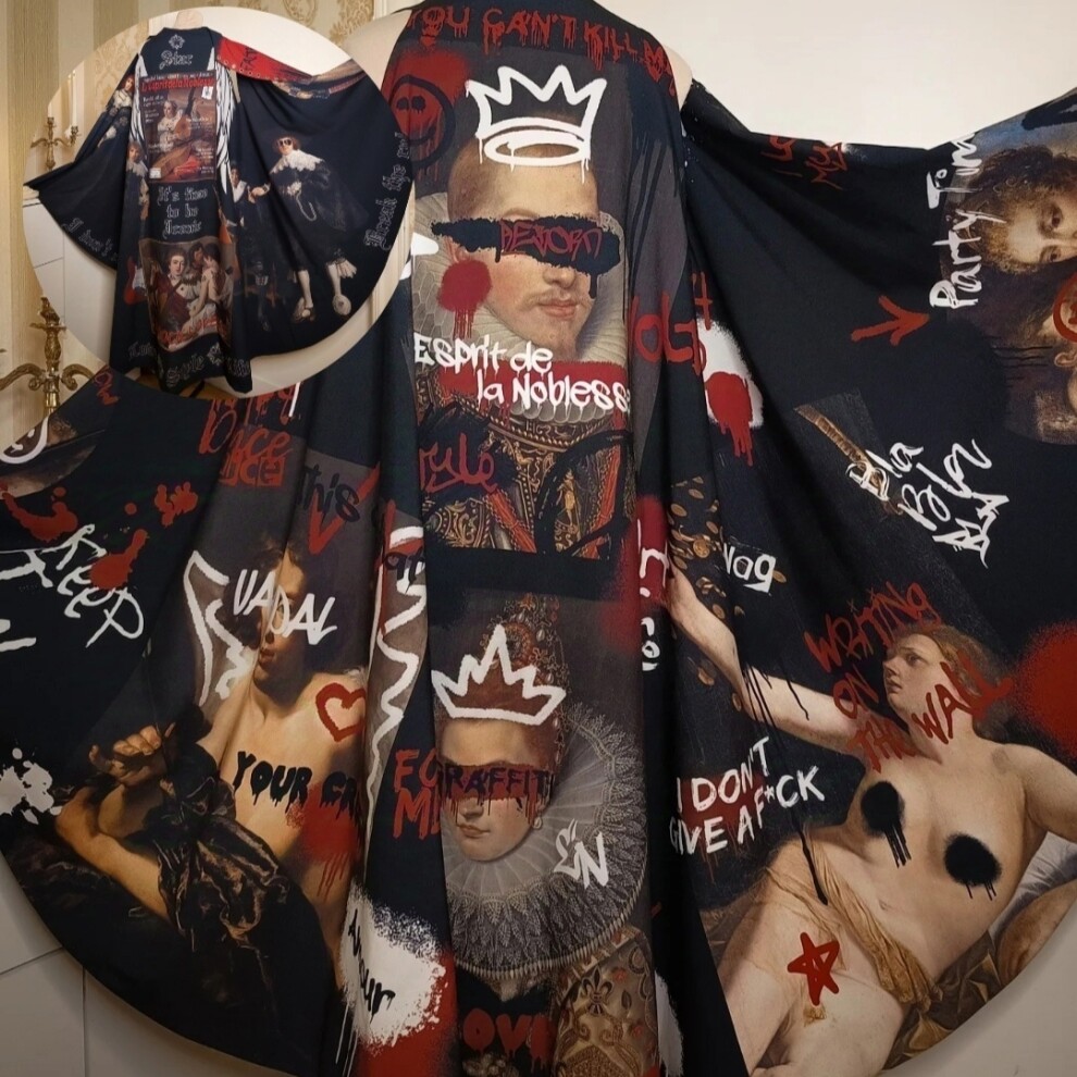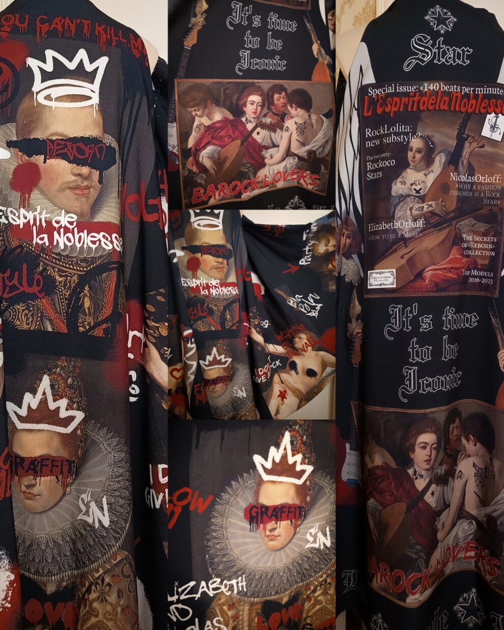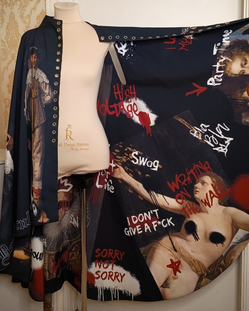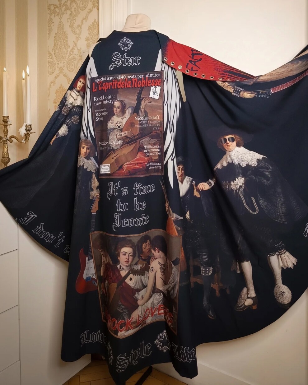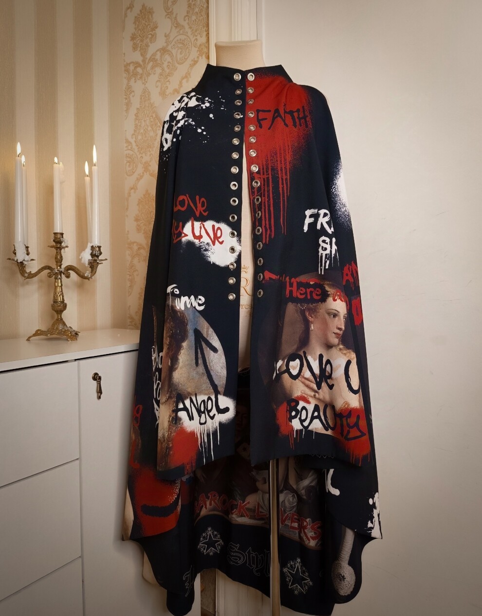 Дерзкий и оригинальный двусторонний плащ-накидка "Рок-стар + Граффити Ренессанс"/"Rock Star + Graffiti Renaissance" из коллекции "140 ударов в минуту"/"140 beats per minute" с авторским уникальным принтом.