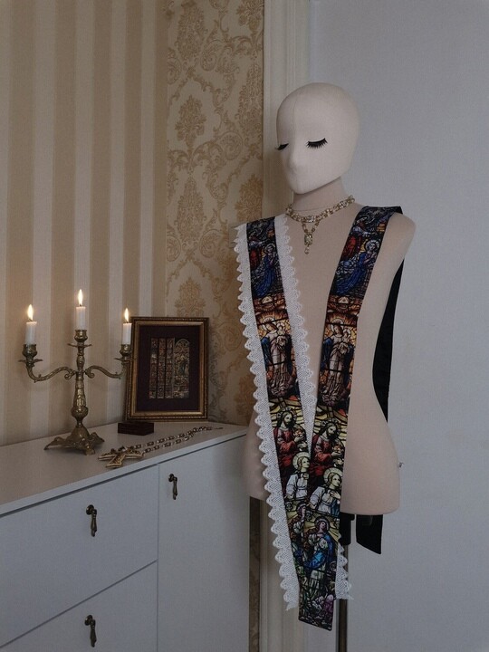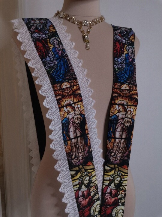 Великолепная перевязь с принтом с витражами, которую можно использовать как шарф, пояс, ленту на шляпу, повязать бантом на сумку или как-то иначе по вашему усмотрению.